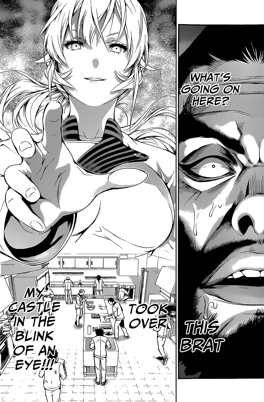 At Excellent, a customer eats one of their main dish revised by Erina and praises that it is an overwhelming improvement from before, and the restaurant is sure to get their first star next year. Upon hearing the customer's assessment, Kasayama returns to his kitchen and sees his chefs swarming around Erina, realizing that she has instantly taken over his restaurant. Erina approaches Kasayama and offers advice to improve his main dish, much to the latter's annoyance and accepts her help. Despite washing dishes, Megumi still believes she can contribute something to improve the restaurant.