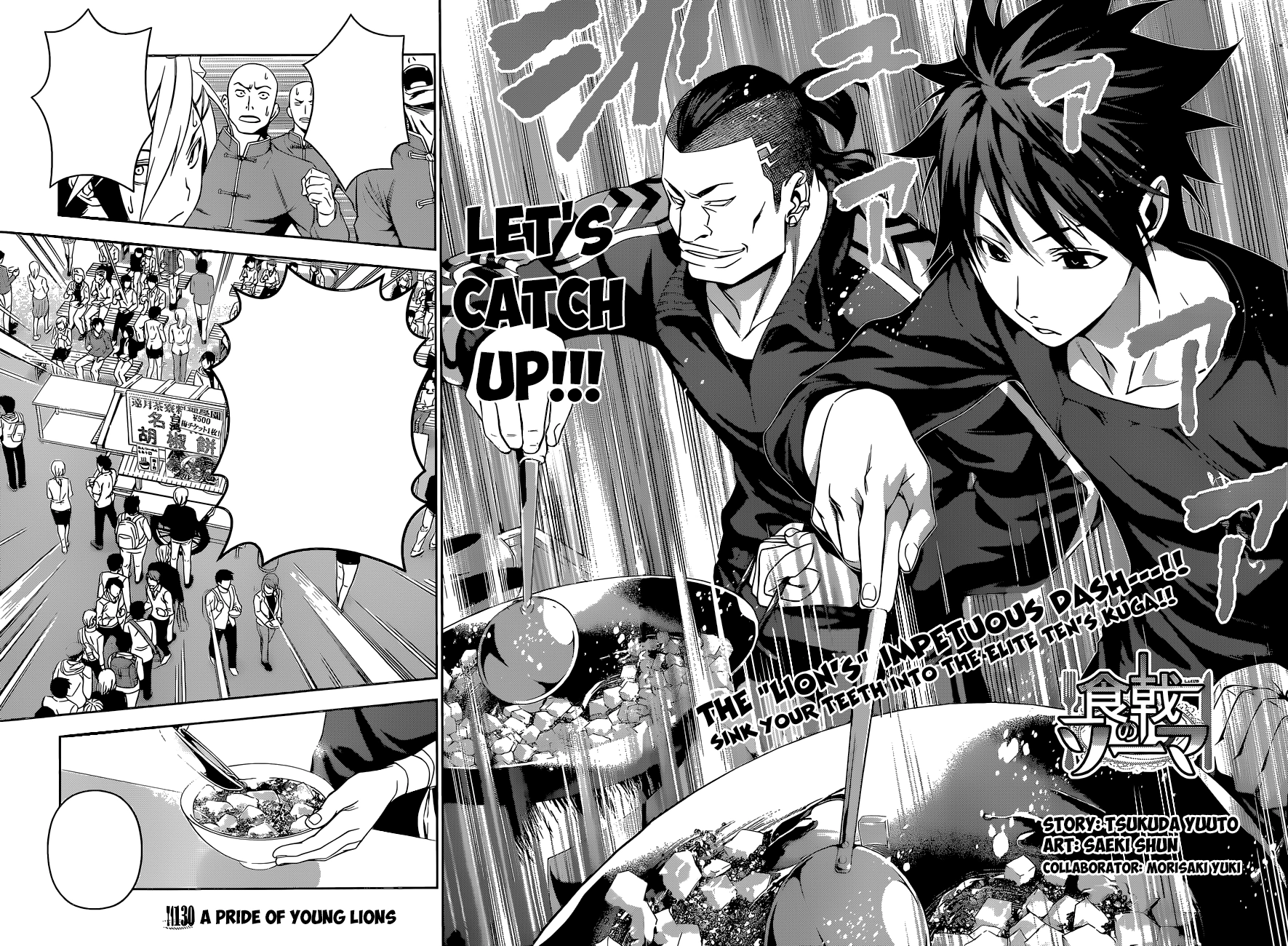 A Pride of Young Lions is the 130th chapter of Shokugeki no Soma. This chapter continues the Moon Banquet Festival Arc.