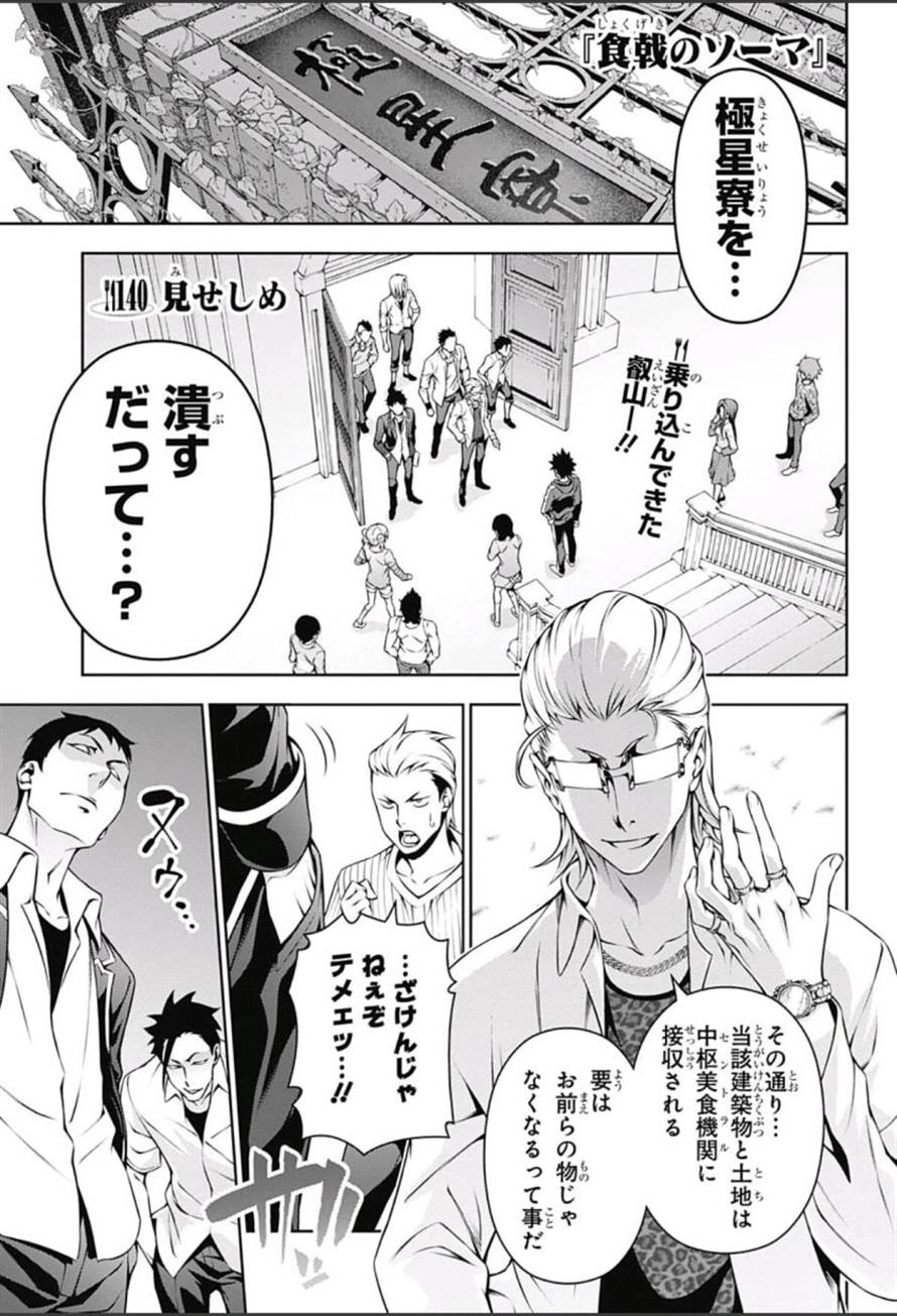 Sōma asks him of an alternative decision that could change the Central's mind. Etsuya replies by challenging him into a Shokugeki. He also tells Sōma that there are requests of Shokugeki from almost every group simply to revert their decision. He also said that he can simply turn down the requests but for the sake of his colleagues, he has decided to accept them. The opponent must know the risks for challenging the Shokugeki and telling Sōma that an upcoming Shokugeki will be a "lesson" for him. Etsuya leaves the dormitory afterwards and lets Sōma's group to watch the televised battle between him and Tetsuji Kabutoyama.