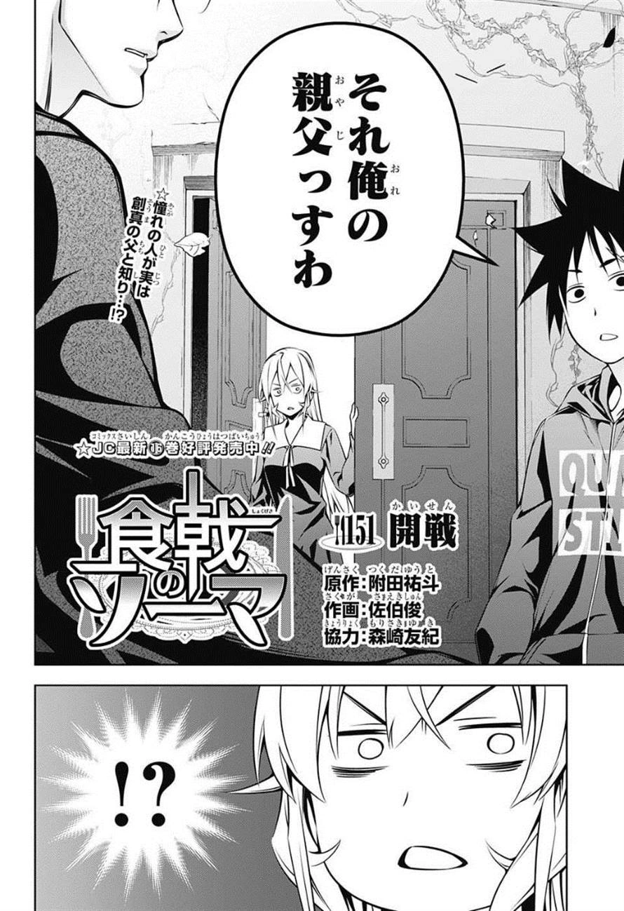 Erina walks out of the dorm just in time for Sōma to reveal to her father that Jōichirō Saiba is his father, to her shock. A surprised Azami questions what this means by this as Sōma repeats that he means what he says Jōichirō is his father.