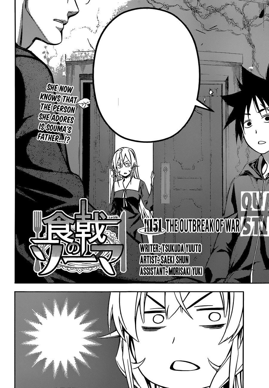 The Outbreak of War is the 151st chapter of Shokugeki no Soma. This chapter begins the Survivor's Purge.