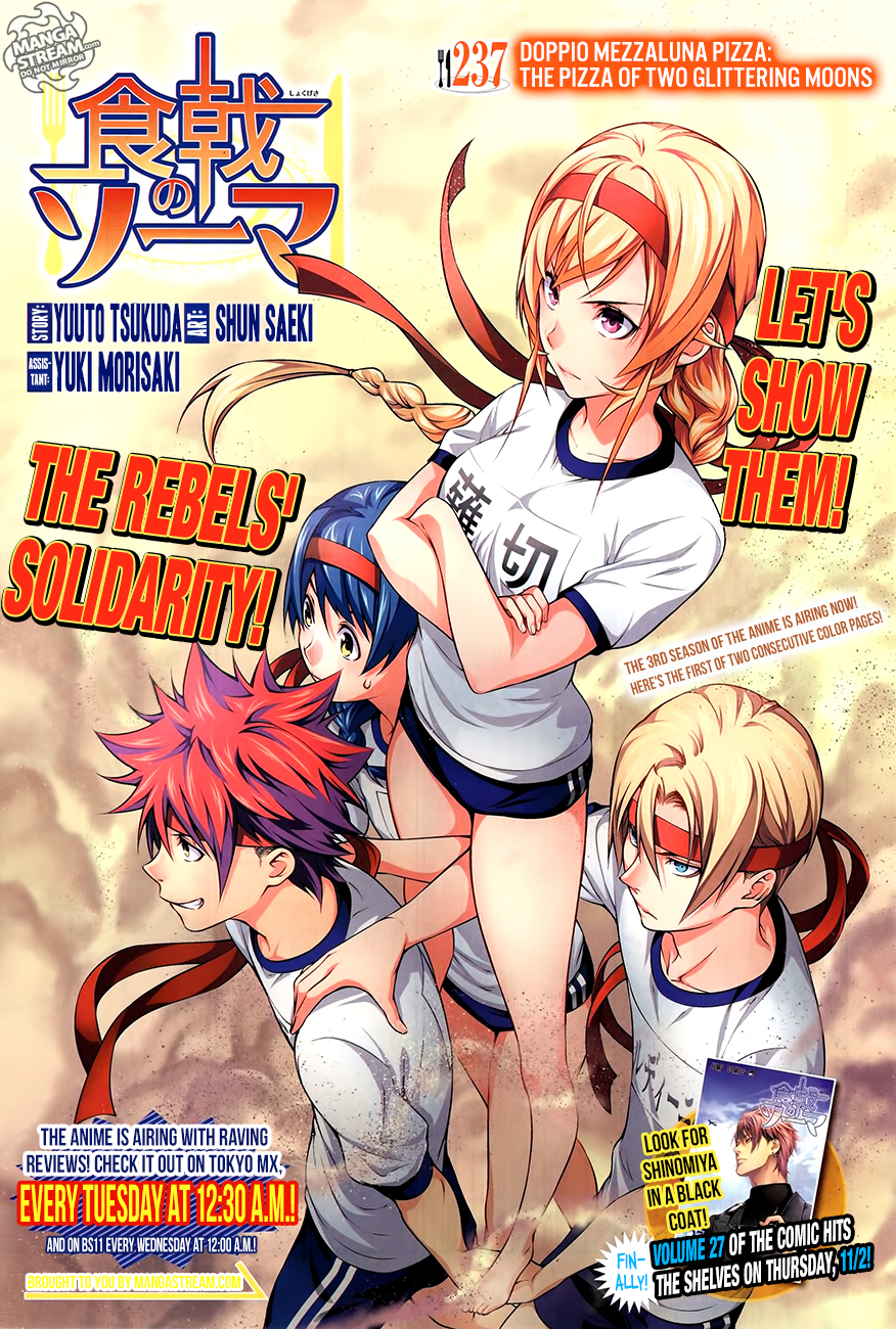 Doppio Mezzaluna Pizza: The Pizza of Two Glittering Moons is the 237th chapter of Shokugeki no Soma.