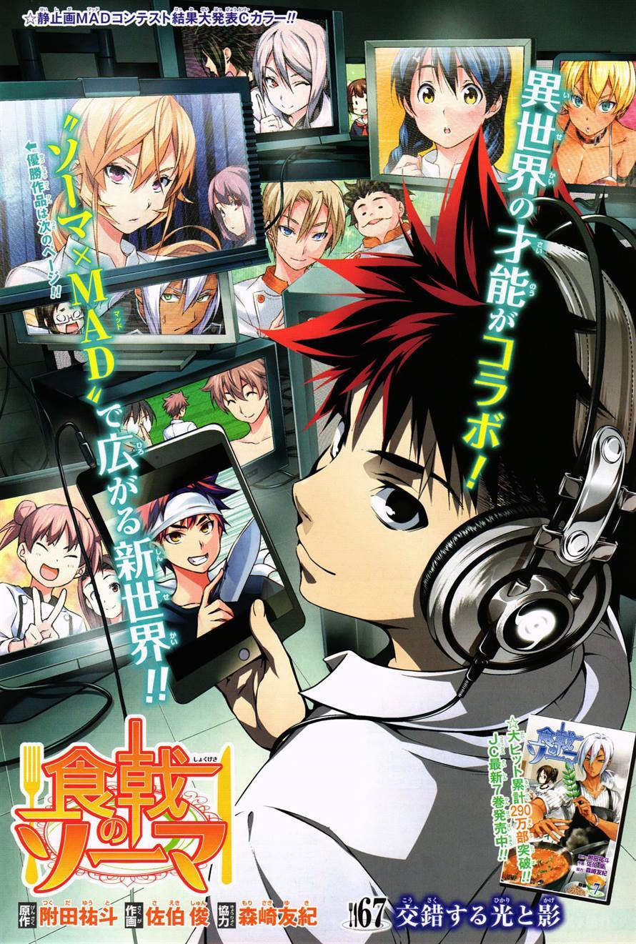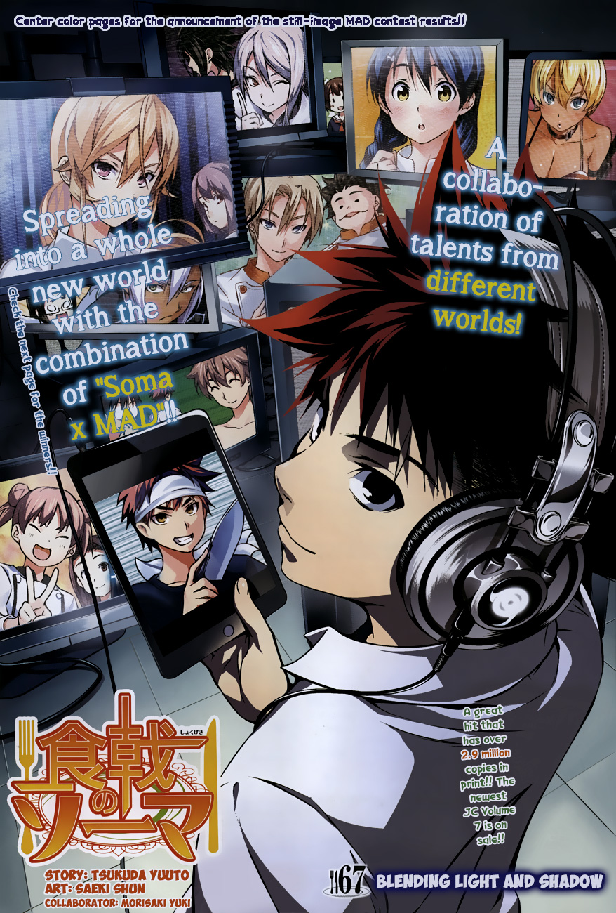 Blending Light and Shadow is the 67th chapter of Shokugeki no Soma. This chapter officially ends the match between Sōma Yukihira and Alice Nakiri and begins the new match between Megumi Tadokoro and Ryō Kurokiba.