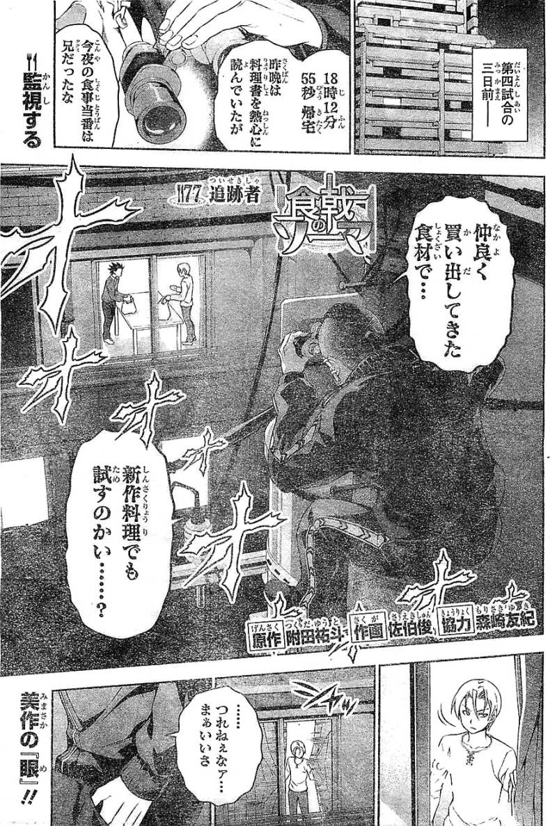 Pursuer is the 77th chapter of Shokugeki no Soma. This chapter officially begins the Quarterfinal match and Shokugeki between Takumi Aldini and Subaru Mimasaka.