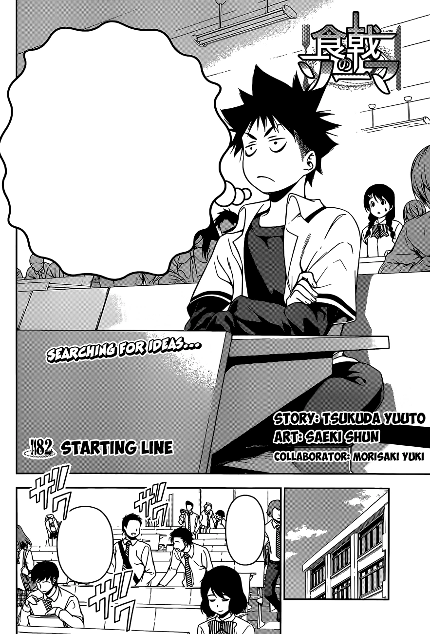 Starting Line is the 82nd chapter of Shokugeki no Soma. This chapter continues Sōma's prep time during the week before the Semifinal round of the 43rd Annual Tōtsuki Autumn Election.