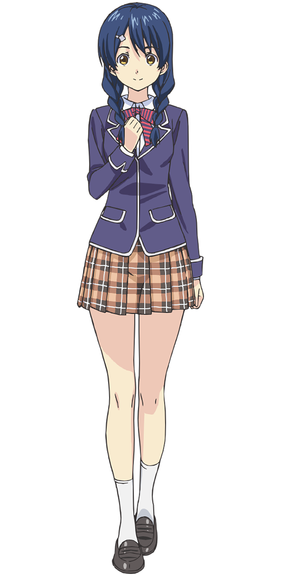 Megumi has long, dark blue hair with two braided pigtails and wears a flower hairpin on the right side of her hair. She has yellow-colored eyes and a petite body figure, possessing a tight, plump rear.