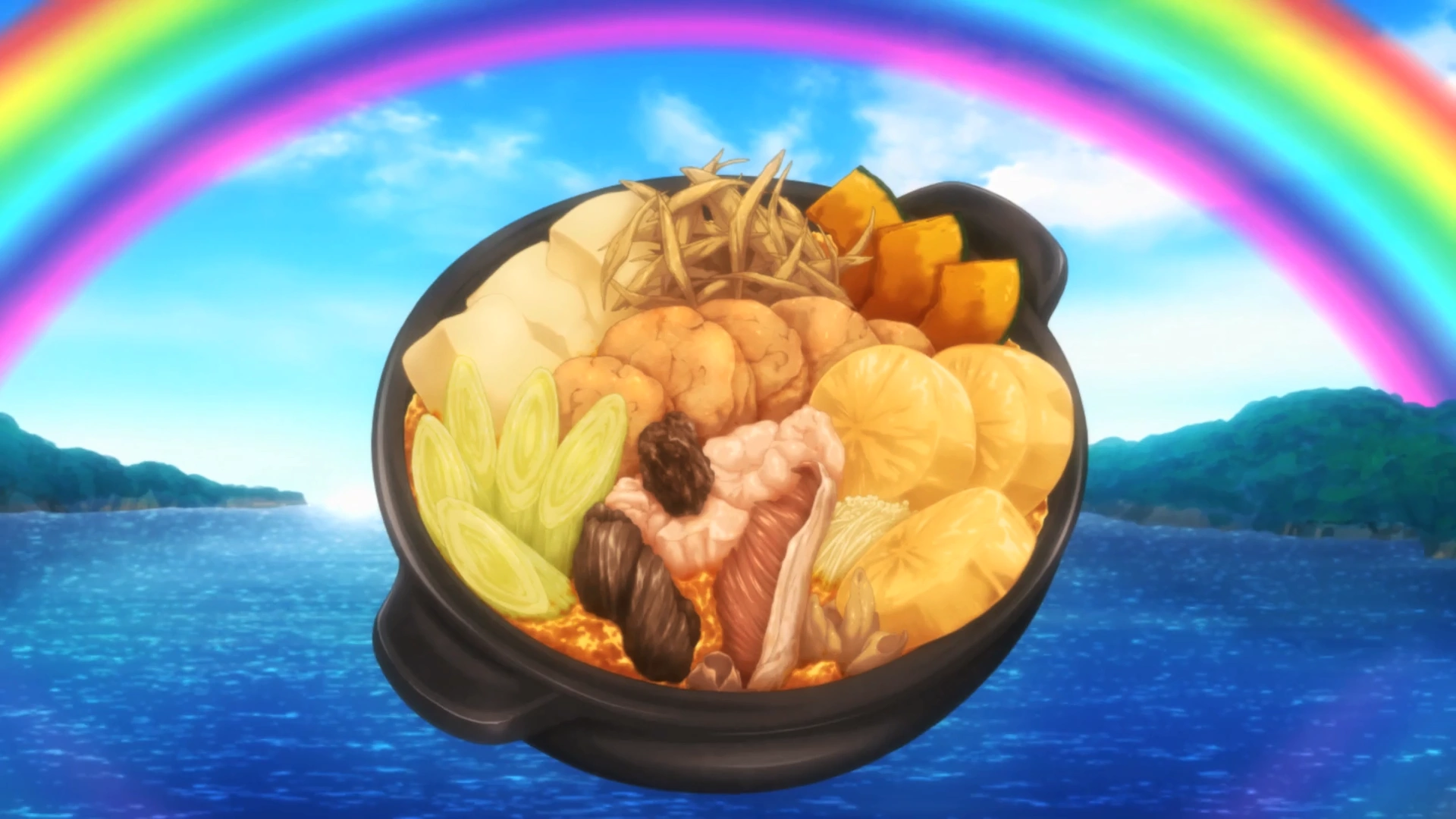 - Rainbow Terrine - A revised dish made by Megumi and Sōma against Kojirō Shinomiya in her first Shokugeki. Using various vegetables, Megumi created a terrine by arranging seven different vegetables into seven different layers to create an image of a rainbow. Thanks to a secret spice added, allspice, the dish gives a digestive effect to ease anyone who eats it. It gives the feeling of walking with one's mother under a rainbow in a sunny sky.