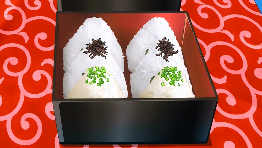 - Three Kinds of Onigiri - Megumi's first known dish made during the story. By making three different Onigiri fillings, Megumi created a refreshing and hearty meal to satisfy the Polar Star residents who were working in the fields that morning.