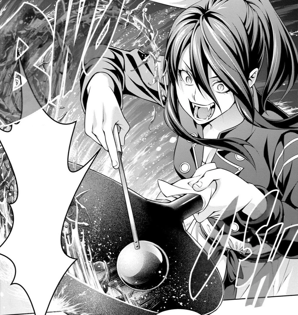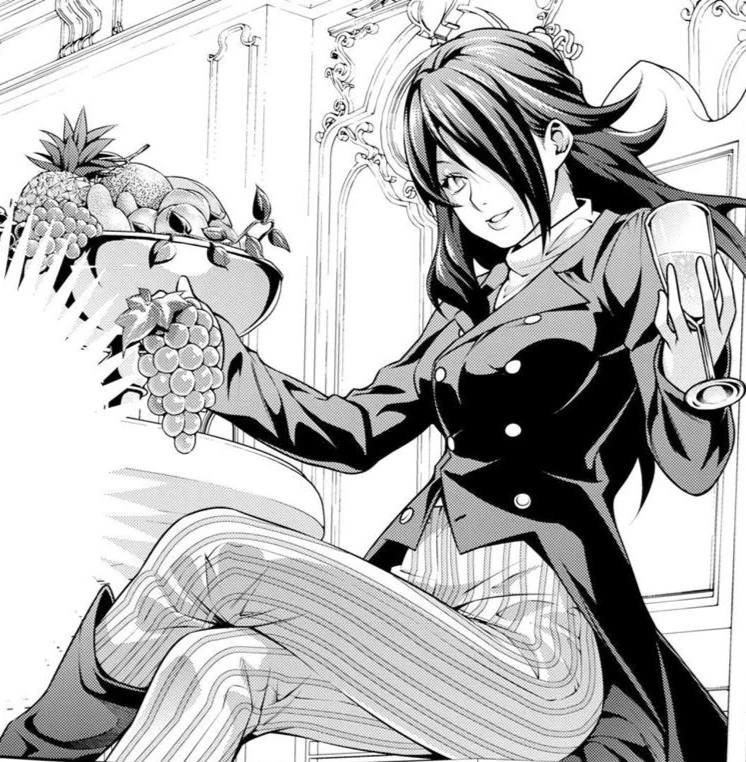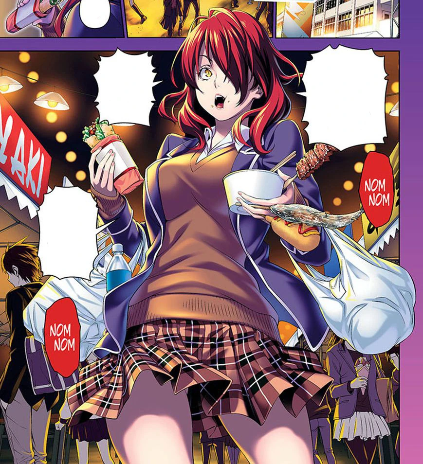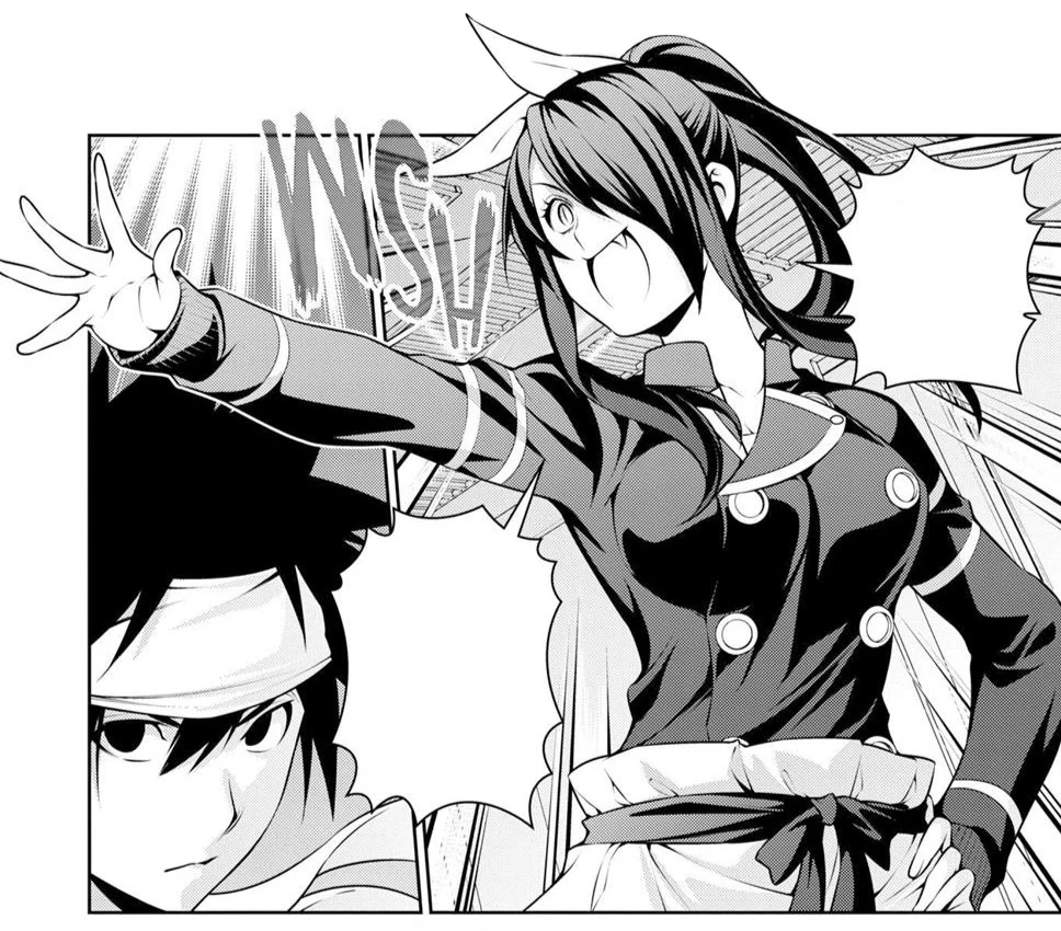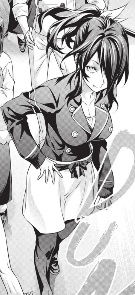 She has shown a particular interest in Soma as a result, offering to take him to experience the booth run by Eishi Tsukasa, the former First Seat in Tōtsuki. Similarly to Satoshi Isshiki, her jovial demeanor hides incredible cooking skills, given that she was the Second Seat of the Elite Ten Council and the former best female student attending Tōtsuki.