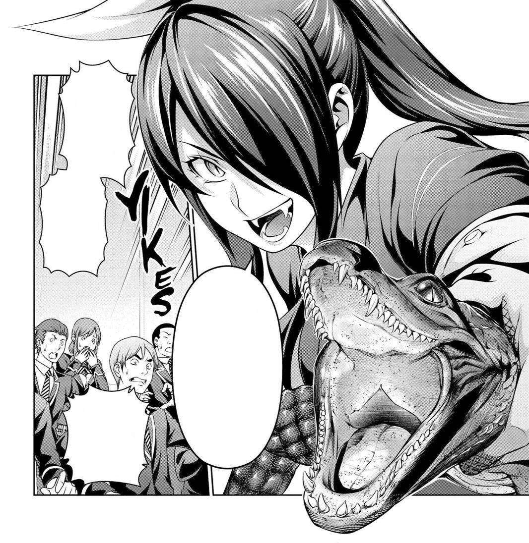 Directly after this exchange, Rindō continued frying the alligator meat with increased intensity which infects the audience as well, and anticipation grows throughout the arena. Meanwhile, Tōsuke also returned to his cooking, and after peering at him for a moment, Rindō stated that for once, Tōsuke is going all out. She then queried why he decided to form an alliance with Soma when she has heard him say multiple times that he didn't care for showdowns, to which Tōsuke responds that he got struck by Yukihira's passion.[40]