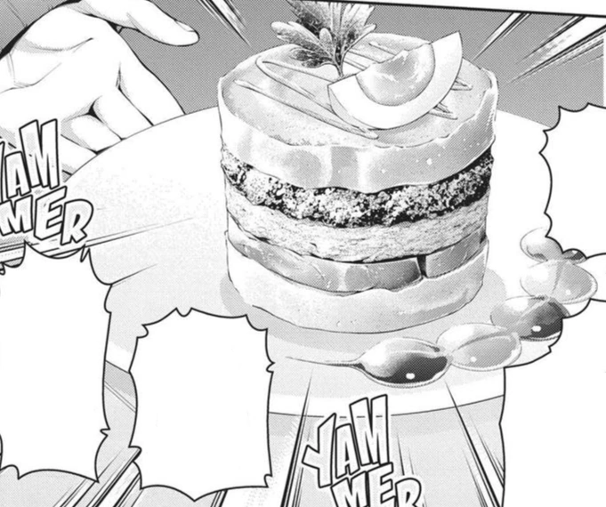 - Mushroom Mille-Feuille~Stuffed with Duxelles~ - Rindō's appetizer for the 5th Bout of the Rebels Vs. Central Régiment de Cuisine. By using formic acid which was extracted from ants, Rindō was able to astringate the rich and mellow sweet flavors of the mille-feuille. From the confit of shiitake mushrooms to the duxelles which is made of button mushrooms, shallots, garlic, butter, stock, crushed chestnuts and formic acid. It is garnished with a dark colored sauce and sliced black truffles. And when combined with Eishi Tsukasa's White Armor Plate: Sauce Chevreuil it can take the consumer to The Gourmet Eden!