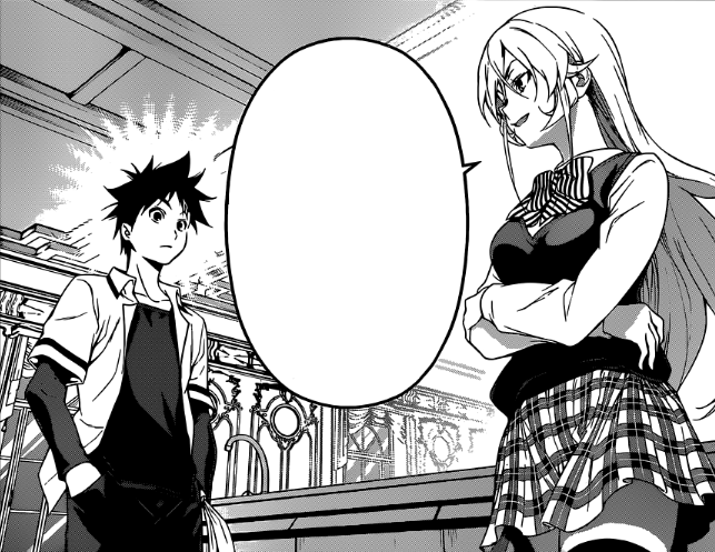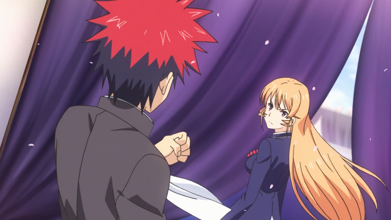 As he entered the backstage area, Sōma encountered Erina, who was surprised that he was in the Academy despite the fact that she personally denied him. Trying to put Sōma in his place, Erina told him that their fellow classmates had formal Tōtsuki culinary education for the past three years while he has not. Sōma responded that he has twelve years of personal kitchen and customer service experience while they have not. Sōma then vowed to make Erina admit his food is good at the end of their High School life.