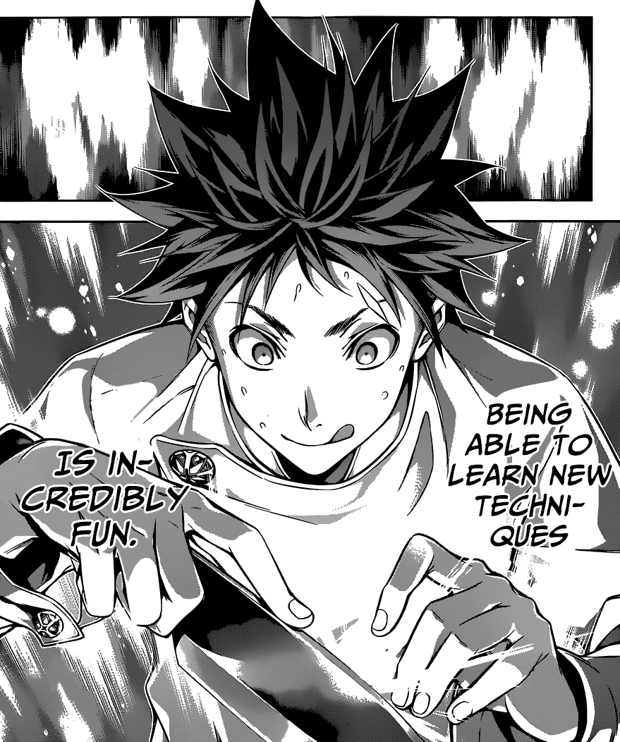 Sōma is courageous and even reckless, often getting himself into very dangerous situations that could jeopardize his entire cooking career. For three Shokugekis, Sōma risked being expelled from Tōtsuki if he lost, while in another Shokugeki he faced giving up being a chef in general forever. Because of his unknown humble origins, Sōma is never the favorite to win most of his matches as he constantly faces his fellow classmates of more noteworthy backgrounds, most of which do not consider him a threat because of their own advantages. Time and time again, Sōma has proven that he is more than capable of overcoming the most difficult challenges with the steepest handicaps. Jōichirō attributes Sōma's strength not to natural cooking talent, but to his courage that allows him to boldly face whoever challenges him, no matter how much of a genius they are or whatever disadvantages they may throw at him. Sōma is not afraid to admit that his opponent is better than him at that moment and that he is not perfect, but he refuses to give up. As such, he is not afraid to examine his own deficiencies, and is even eager to learn whatever he needs to in order to overcome them. Sōma's lifelong goal is to become a better chef than his father and thus will fight to the very end to achieve his dream. He will plunge head first into trial and error until he gets to the end results that he displays in his duels, spending days or even weeks exhausting every possible option until he finds the best one. Even in defeat, Sōma takes it as a sign that there is still much more for him to learn.