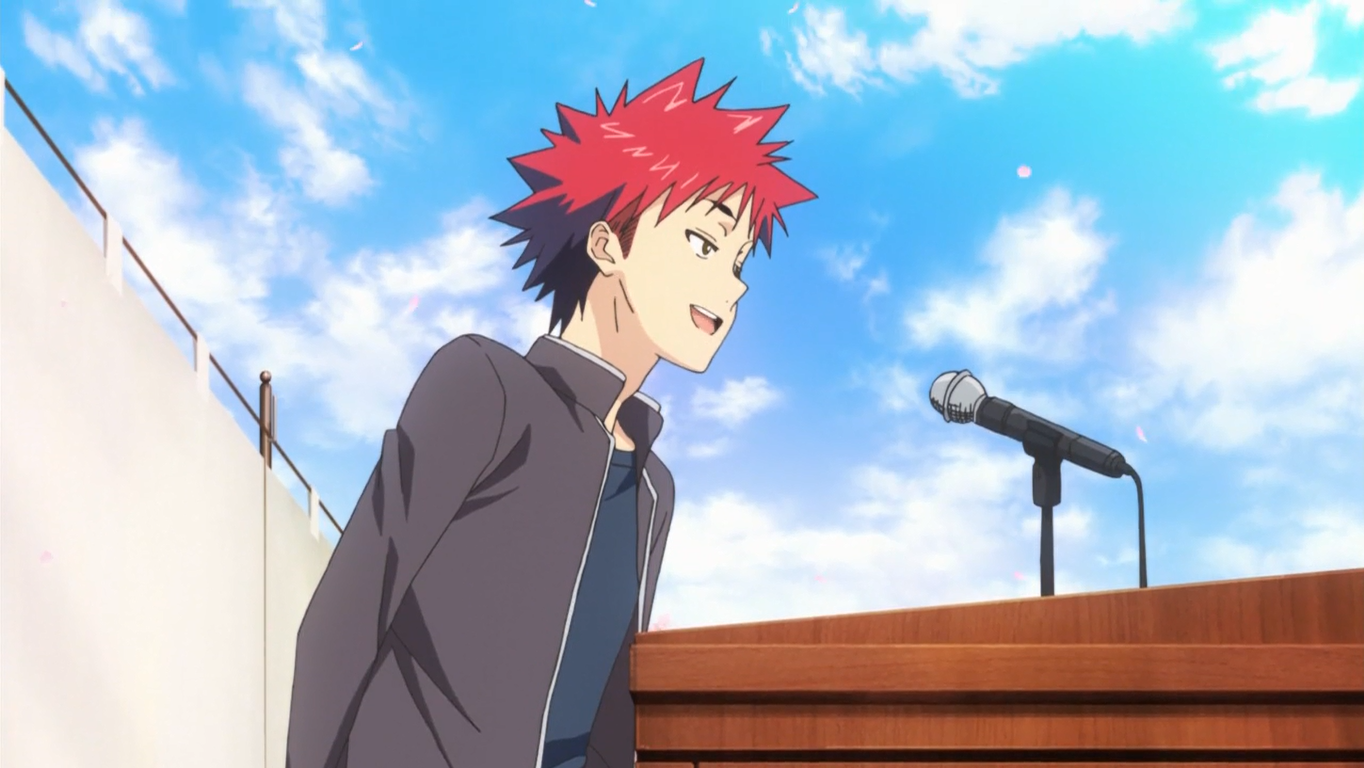 One month after the entrance exam, Senzaemon Nakiri welcomed the 92nd Tōtsuki Generation into Tōtsuki Culinary Academy but warned them that of the 1000 current students, less than ten percent will graduate. After giving his speech, he introduced a student who was the only one to pass the entrance exam at the high school level: Sōma. Sōma then gave his speech, declaring that he will be the one to stand at the top of Tōtsuki at the end of their High School life and will use the academy as a stepping stone to get there. All of the students at the ceremony did not take his comment well and angrily booed him as he walked off the stage.