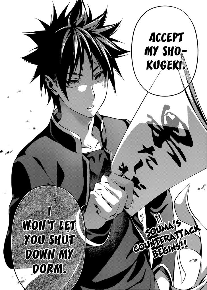 The next morning, Sōma woke up early and waited in the dormitory dining room to challenge Satoshi for his Elite Ten seat. However, Satoshi explained the rules to make a Shokugeki, an official cooking duel students can issue in the school. Satoshi told Sōma that since he did not want to fight him, the duel was not feasible. Also, the weight of an Elite Ten seat would cost more than just Sōma being expelled. Sōma accepted that his goal to enter the Elite Ten would have to wait.