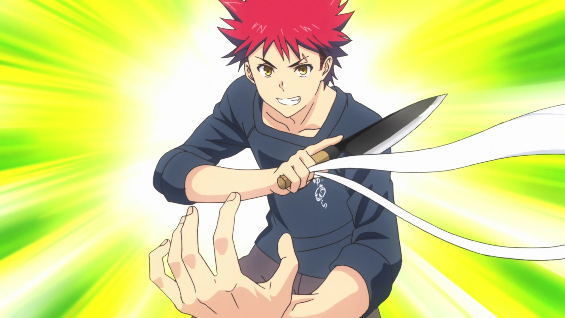 When Sōma was in his 5th year of elementary school, his family tasked him with handling a fish. The fish still had some fight left in it, causing Sōma to nearly drop it. In his effort to prevent an ingredient from touching the floor, Sōma fell and hit his head on the corner of the table, resulting in a lasting scar over his left eyebrow.