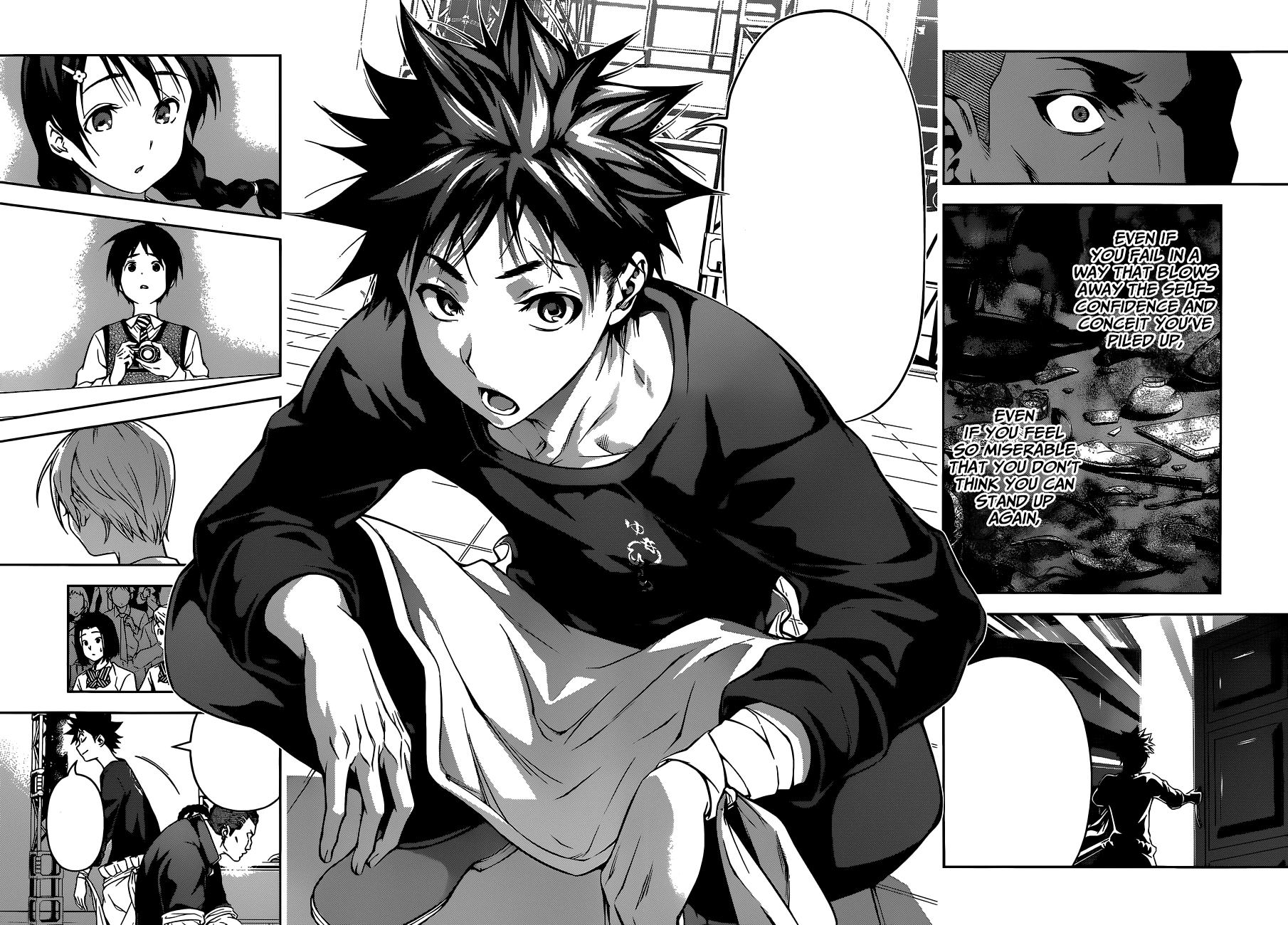 In another flashback, Sōma was bogged by a huge surge of customers. Unable to keep up the pace and his nerves were getting the best of him, the inexperienced Sōma felt his hands go numb and his mind went blank. Jōichirō employed a tactic to calm his son down by clapping hard on Sōma's hands. Confused over the action, he learned that panic and lack of self-confidence due to unexpected pressure is a chef's greatest weakness in Jōichirō's mind. He advised that if Sōma finds himself in a similar situation again, he should use his imagination to plan through it. This one line influenced Sōma through various challenges despite daunting handicaps and restrictions throughout his life at Tōtsuki. He also kept his father's hand clapping technique in mind in case any of his partners needed the same boost.